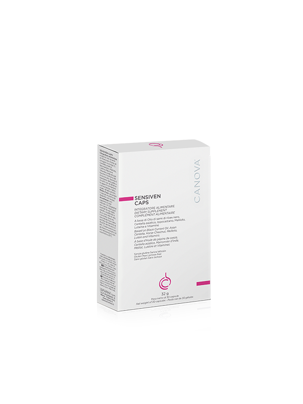 SENSIVEN CAPS Dietary supplement is based on Black Currant Oil (a source of Omega-3 and Omega-6 fatty acids), Centella Asiatica, Horse Chestnut, Sweet Clover, Lutein, Niacin and Vitamins. Recommended for improving microcirculation trophism, supporting skin wellbeing and in all cases of poor food supply or when there is a need to increase the supply of these nutrients.