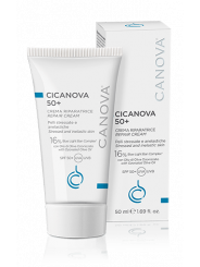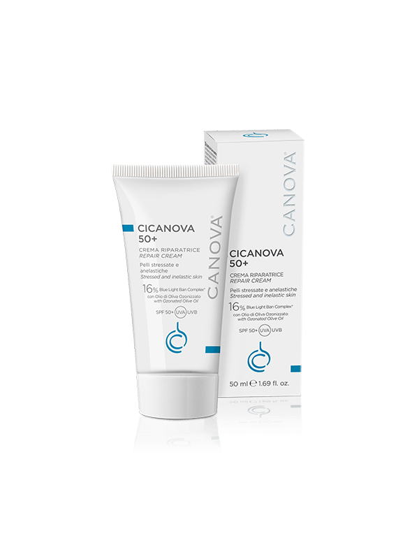 CICANOVA 50+ repair cream is recommended for the photoprotection of fragilised or stressed skin and to prevent scarring blemishes (hypertrophic scars and keloids). It is based on Ozonated Olive Oil, which helps to replenish the hydrolipid film of skin, and a set of sun filters, which provides very high UVA and UVB protection. This state-of the-art formula also includes a set of filters specifically designed to protect skin from blue light and the oxidative damage it induces, which might interfere with the skin healing process.