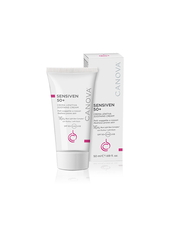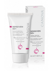 SENSIVEN 50+ soothing cream is a treatment with a strong soothing effect, designed to reduce typical couperose skin blemishes and relieve related symptoms. It is based on Rutin and Diosmin, which stimulate the trophism of capillaries and favour their physiological permeability, and a set of sun filters, which ensure very high UVA and UVB protection. The product also contains a set of filters to specifically protect skin from blue light and the oxidative damage it induces.